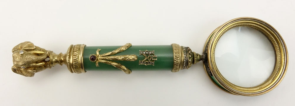Early 20th Century Russian Gilt 88 Silver Mounted Nephrite Jade and Guilloche Enamel Magnifying Glass with Elephant Finial and with European and Rose Cut Diamond Accents in Fitted Box Signed Faberge. Stamped Faberge, 88 Kokoshnik and EK. Good condition. Measures 6-1/4" L, 1-3/4" W. Shipping $38.00 (estimate $1600-$2400)