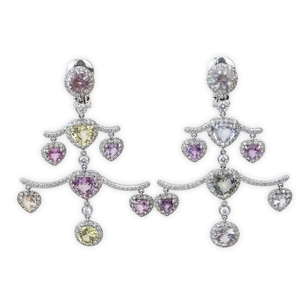 Vintage Pair of Fred Leighton Approx. 15.0 Carat Heart Shape Multi Color Sapphire, 5.0 Carat Round Brilliant Cut Diamond, Platinum and 18 Karat White Gold Chandelier Earrings.