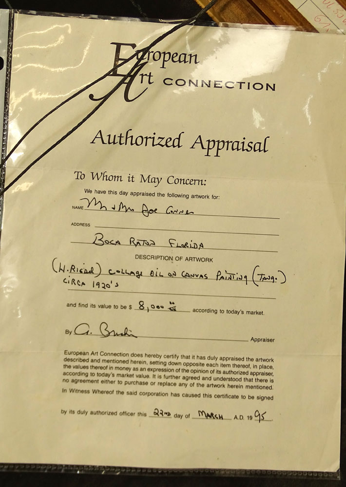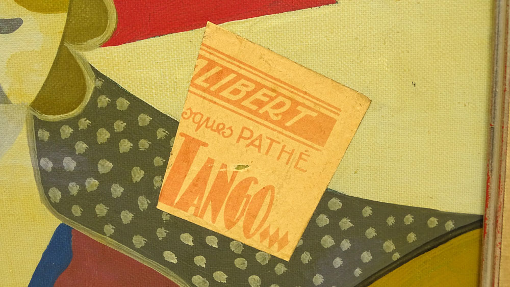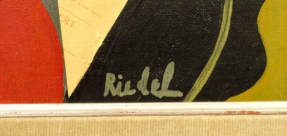 Helene Riedel, German (1901 - ) Oil and Collage on Artist Board "Tango". Signed lower right circa 1930. Good condition. Original purchase receipt from European Art Connection, 1995 accompanies this lot. Measures 19-1/2" x 24, frame 26-3/4" x 31-1/4. Shipping $115.00 (estimate $4000-$6000)