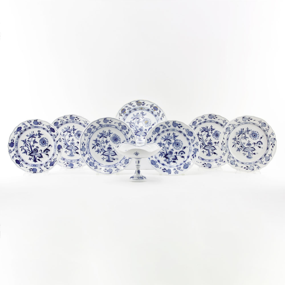 Grouping of Eight (8) Meissen Blue Onion Porcelain Tabletop Items. Includes 7 plates and 1 compote. Gilt wear to 1 plate, nicks to base on 1 plate, good condition. Plates measures 10" D, compote measures 5-3/4" H x 8" W. Shipping $68.00 (estimate $300-$400)