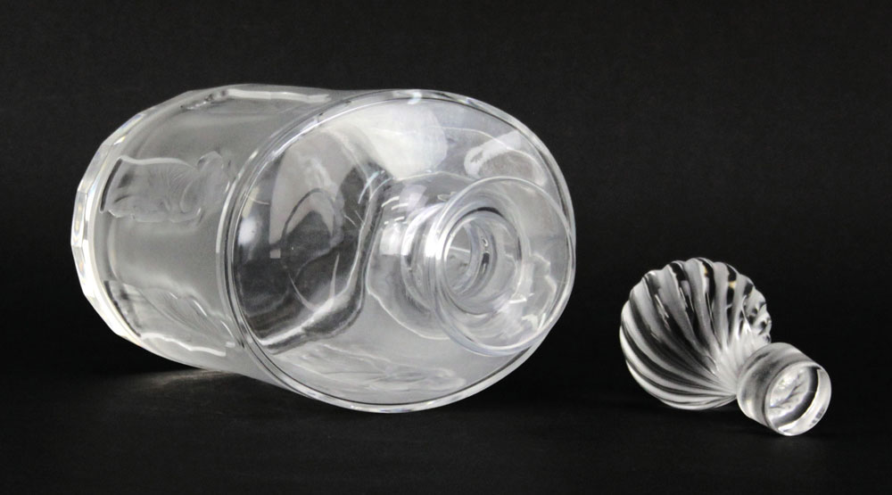Lalique Crystal "Femmes" Decanter and 4 Glasses. Signed. Decanter with light film/cloudy or in good condition. Decanter measures 9-5/8" H, glasses 4" H. Shipping $75.00 (estimate $800-$1000)