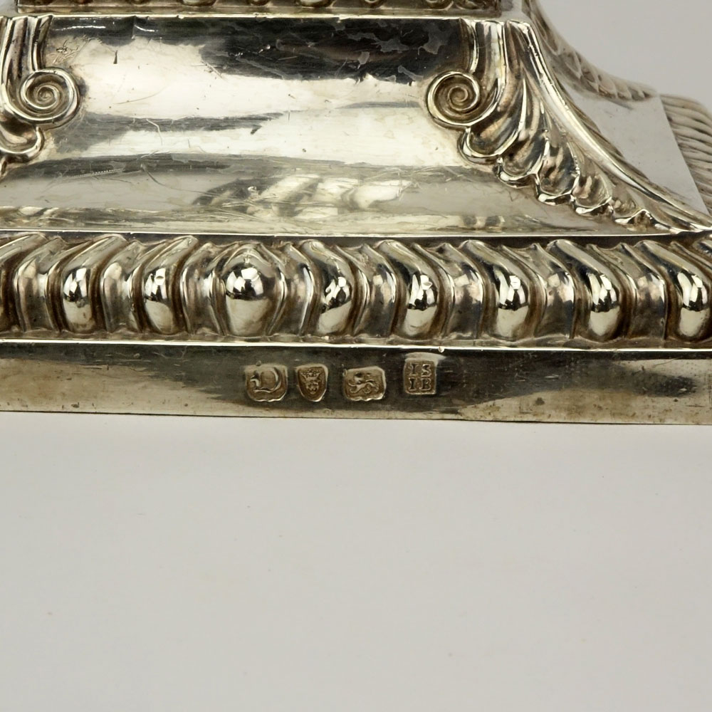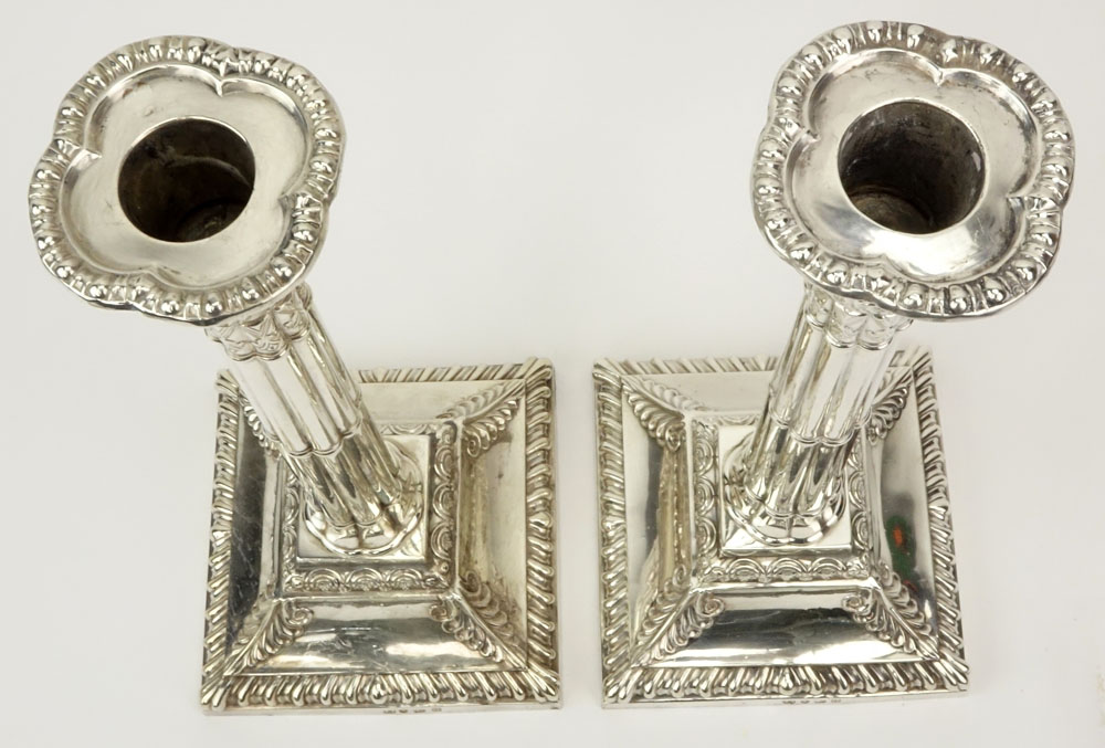 Pair of 18th Century English Silver Weighted Candlesticks. Hallmarked London, 1759, makers mark I.S. over I.B. Small dings, rubbing consistent with age. Measure 12" H. Shipping $75.00 (estimate $1500-$2500)