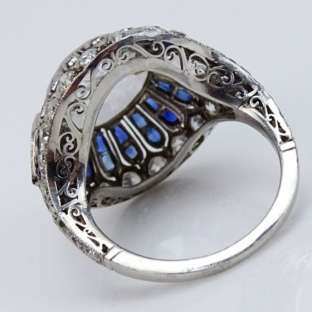 Art Deco Design Approx. 3.0 Carat Rose Cut Diamond and Platinum Filigree Ring accented with Two Pear Shape Diamonds 1.30 Carat TW, Invisible Set Calibre Cut Sapphires and 2.50 Carat TW European Cut Diamonds. Center diamond E-F color, SI2 clarity. Unsigned. Small chip to girdle of center diamond otherwise good condition. Ring size 7. Approx. weight: 5.80 pennyweights. Shipping $30.00 (estimate $15000-$20000)