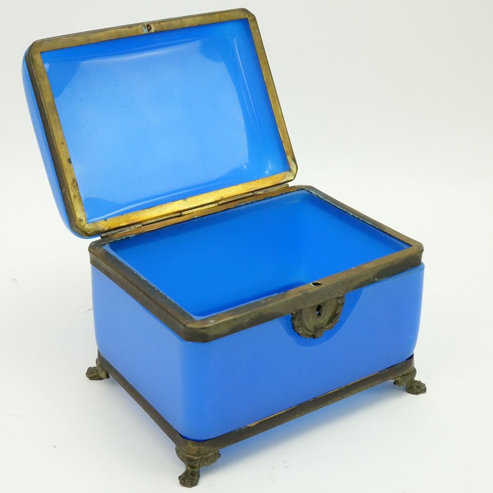 Large Antique Blue Opaline Glass Dresser Box. Brass hardware and footed. Missing key, good condition. Measures 5-1/2" H x 7-1/4" W x 5-1/4" D. Shipping $68.00 (estimate $800-$1200)