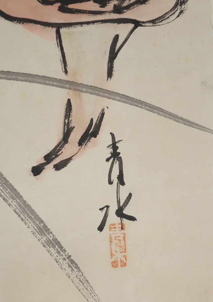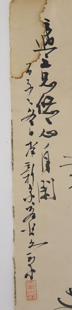 Antique Chinese Watercolor on Rice Paper Laid On Paper. Flower decoration. Prose upper left, signed and stamped throughout. Rough edges, some staining. Measures 53" x 13-1/4". Shipping $38.00 (estimate $100-$200)