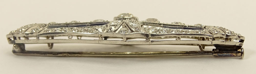Art Deco Approx. 2.5 Carat Old European Cut Diamond, Sapphire and Platinum Bar Brooch.