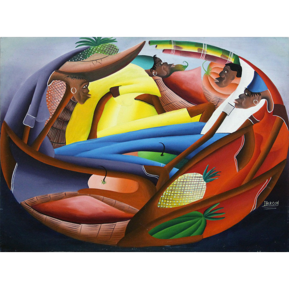 Vintage Haitian "Merchants" Folk Art Oil Painting Signed Jackson Lower Right