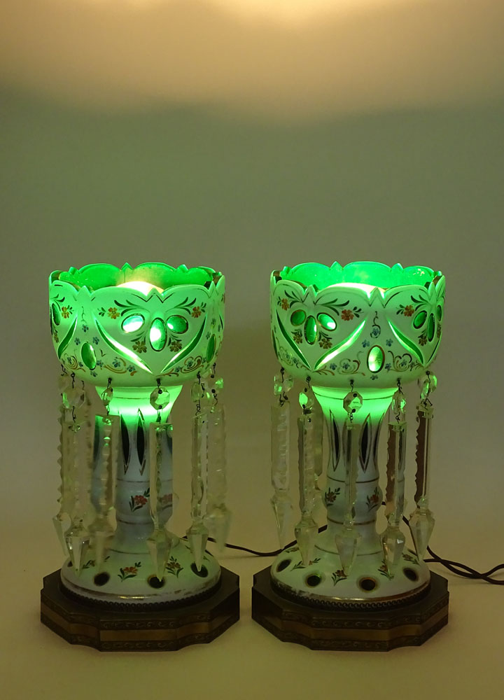 Pair of 20th Century Bohemian Glass Lusters. Electrified and with bronze bases. Unsigned. Minor chips to pendants, rubbing to gilt decoration otherwise good condition. Measure 13-1/4 Inches Tall and 7-1/4 Inches Wide at Base. Shipping $250.00 (estimate $225-$275)
