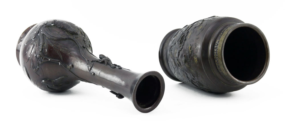 Grouping of Two (2) 19/20th Century Japanese Patinated Bronze Vases. Includes: a "long-neck" vase with raised bird motif along with a similar raised relief vase with "birds" motif. Felt to both bases, some whiting to long-neck vase otherwise in good condition. Largest measures 12" H, smaller measures 8" H. Shipping $68.00 (estimate $200-$300)