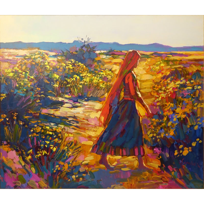 Nicola Simbari, Italian (1927-2012) Oil on canvas "Sonoran". Signed lower right. Very good condition. Measures 43-1/2" x 51-1/2", frame measures 47-1/4" x 55-1/4". Shipping: Third party (estimate $8000-$10000)
