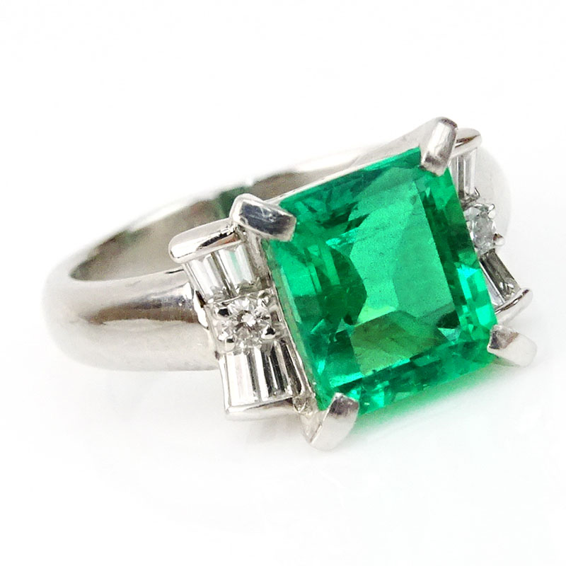 Approx. 2.31 Carat Emerald Cut Emerald and Platinum Ring accented with .30 Carat Baguette and Round Cut Diamonds. Emerald with vivid saturation of color. Signed PT900. Very good condition. Ring size 4. Approx. weight: 4.95 pennyweights. Shipping $28.00 (estimate $2500-$3500)