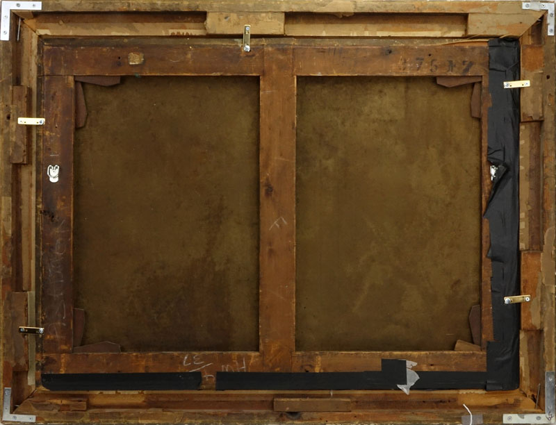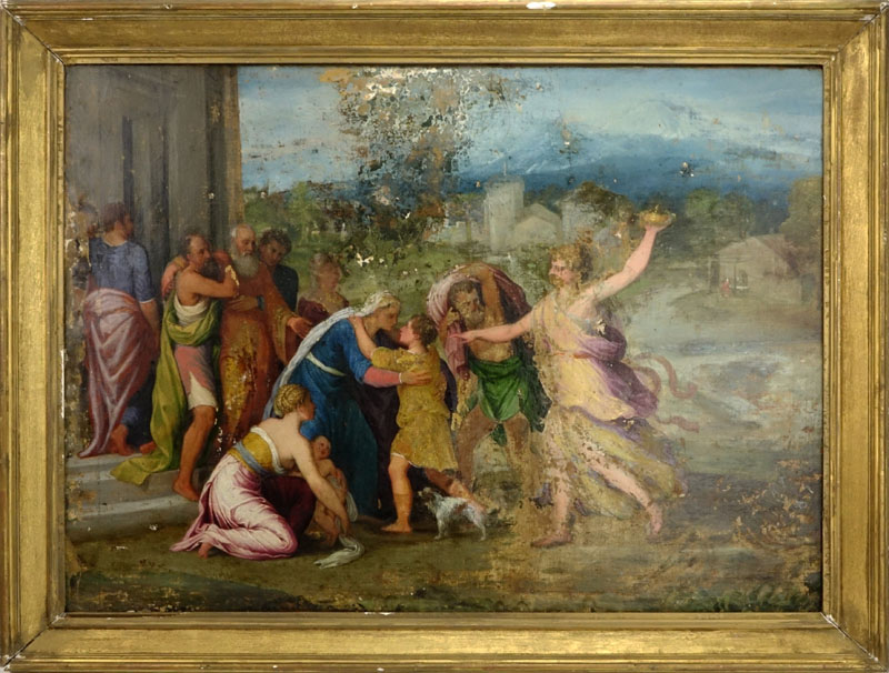 Attributed To: Lambert Sustris, Dutch (1515-1568) 16th Century Oil on Canvas "Voor de Terugkeer Van Het Kind" Unsigned. Depicts a classical scene with child returning home to the family. Some paint loss and wear to canvas, varnish over canvas for preservation otherwise good condition. Measures 27" H x 36-1/2" W (sight), frame measures 33" H x 42" W. Shipping: Third party (estimate $1000-$1500)