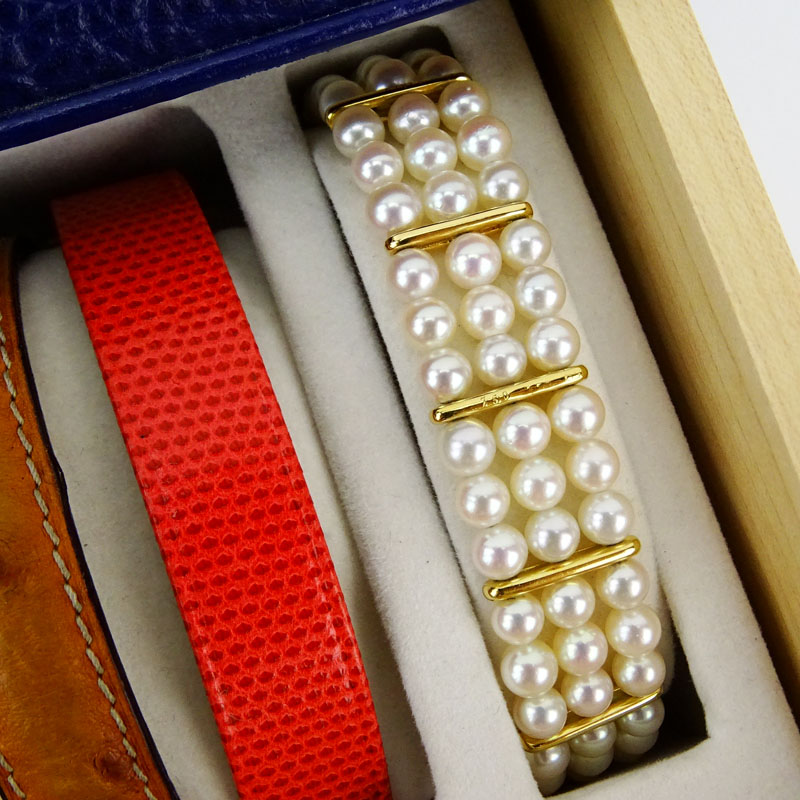 Lady's Boucheron Les Montres 18 Karat Yellow Gold Bracelet Watch with Pave Set Diamond Dial and Diamond Accented Bracelet, Automatic Movement and with Four (4) Additional Interchangeable Bracelet/Straps Including Pearl Bracelet, Ostrich Strap, Lizard Strap and Silk Strap. Stamped to Case, numbered AD 1 11890. Good condition with Box and Papers. Running. Please note the gallery does not warranty the running condition of watches. Case measures 18mm x 29mm. Shipping $40.00 (estimate $10000-$15000)