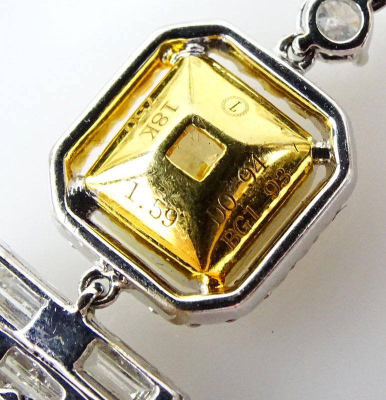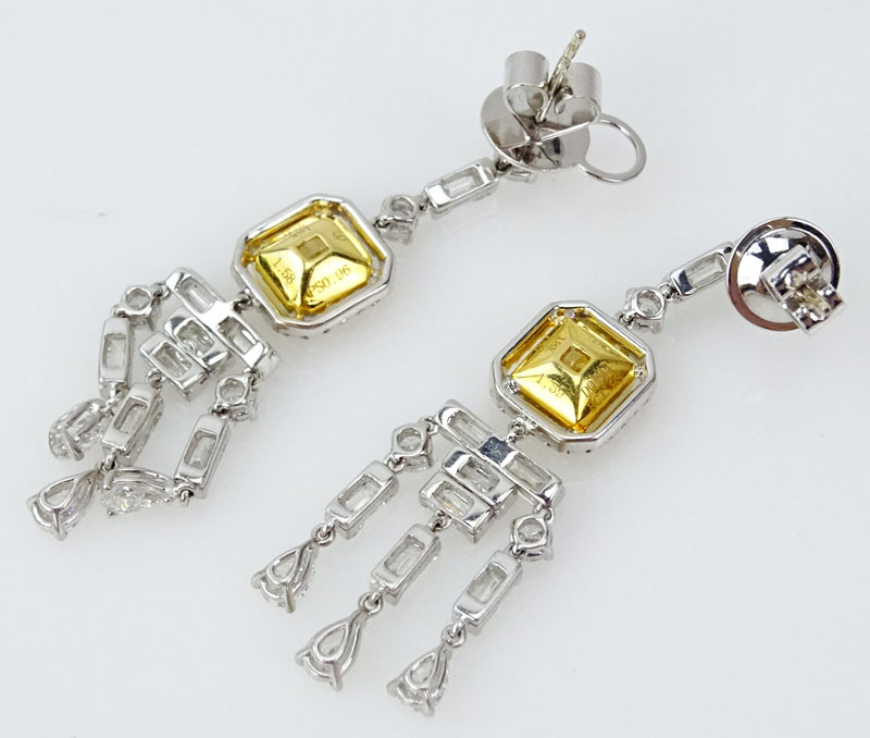 Fine Quality Approx. 3.17 Carat TW Radiant Cut Fancy Yellow Diamond, 3.83 Carat TW Round Brilliant, Pear Shape and Emerald Cut Diamond, Platinum and 18 Karat Yellow Gold Chandelier Earrings. Yellow diamonds VVS clarity. White diamonds D-E color, VVS clarity. Signed. Very good condition. Measure 1-3/4" L, 1/2" W. Approx. weight: 6.35 pennyweights. Shipping $30.00 (estimate $18000-$25000)