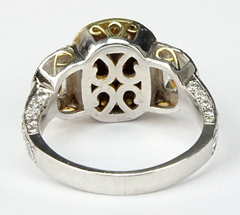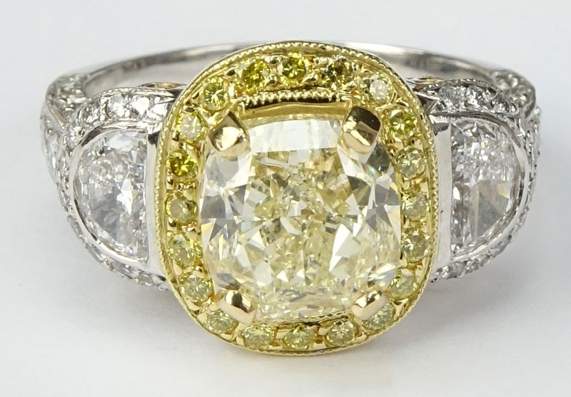 Approx. 3.40 Carat Cushion Cut Fancy Light Yellow Diamond, 1.70 Carat Diamond and Platinum Engagement Ring. Center diamond SI1 clarity. White diamonds E-F color, VVS-VS clarity. Signed Plat. Very good condition. Ring size 8. Approx. weight: 7.70 pennyweights. Shipping $28.00 (estimate $12000-$18000)