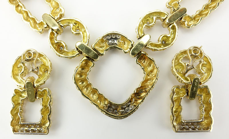 Retro 1950s Approx. 10.0 Carat Round Brilliant Cut Diamond and Heavy 18 Karat Yellow Gold Necklace and Earring Suite. Diamonds D-E color, VS1-VS2 clarity. Stamped VCA 18K. Very good condition. Necklace measures 20" L, 2" W. Earrings measure 1-7/8" L, 7/8" W. Approx. total weight: 240.6 pennyweights. Shipping $44.00 (estimate $20000-$30000)