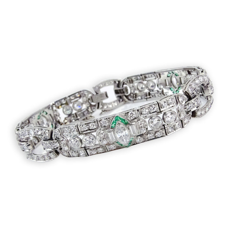 Circa 1920s Art Deco Approx. 11.0-11.50 Carat Old European Cut Diamond and Platinum Bracelet with Colombian Emerald Accents. Diamonds E-F color, VS1-VS2 clarity with a few SI1. Signed Plat. Good condition. Measures 7-1/4" L, 1/2" W. Approx. weight: 21.15 pennyweights. Shipping $30.00 (estimate $12000-$18000)