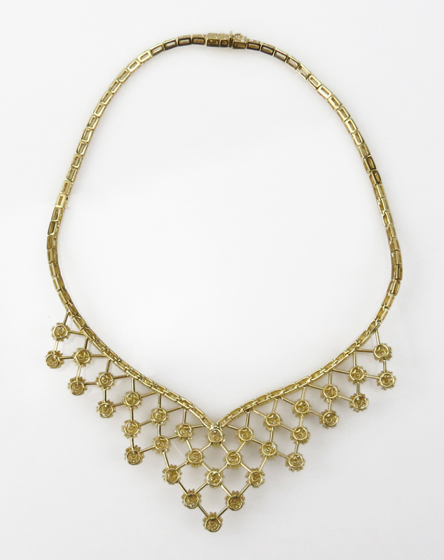Fine Quality Approx. 10.0-11.0 Carat Round Brilliant Cut Diamond and 18 Karat yellow Gold Bib Necklace. Diamonds E-F-G color, VS1-VS2 clarity. Stamped 750. Very good condition. Measures 15" L, 1-1/2" W. Approx. weight: 33.5 pennyweights. Shipping $34.00 (estimate $8000-$12000)