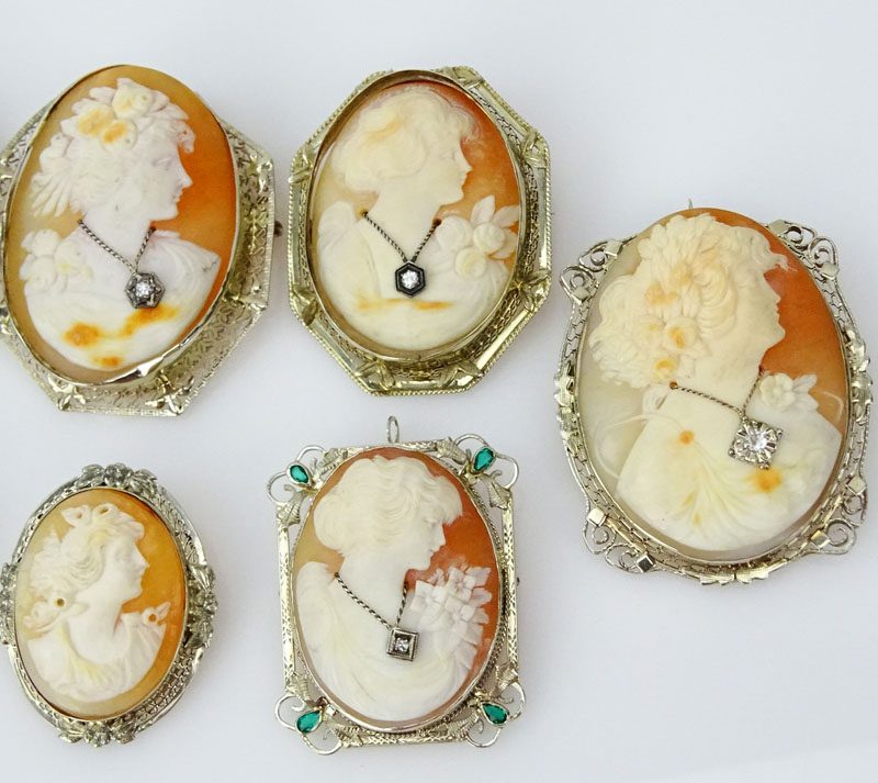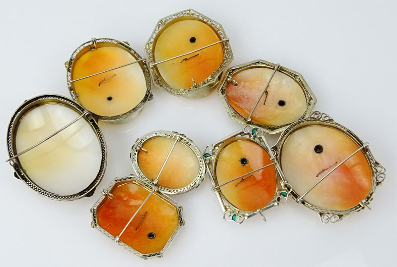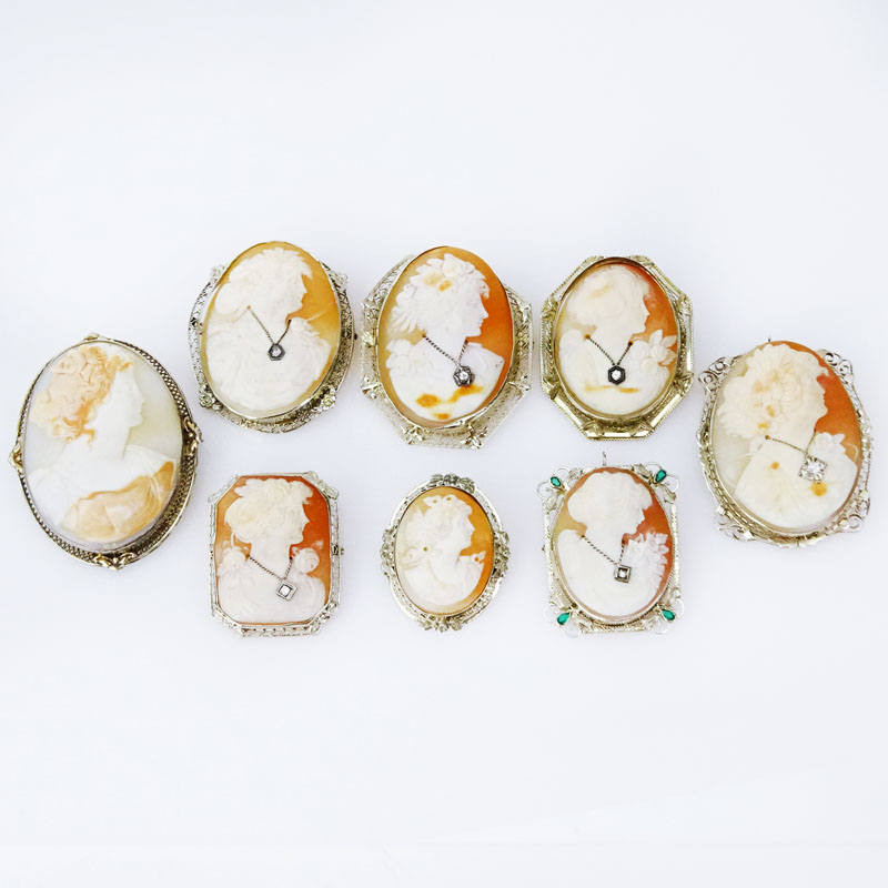 Collection of Eight (8) Art Deco Carved Shell Cameos Variously Bezel Set in White Gold, Silver or Gold Filled Mountings, Six with Small Diamond Accents, One with Emerald Accents. Sizes range from 2-1/4" H to 1-5/8" H. Very good condition. Approx. total weight: 62.36 pennyweights. Shipping $64.00 (estimate $1600-$2000)
