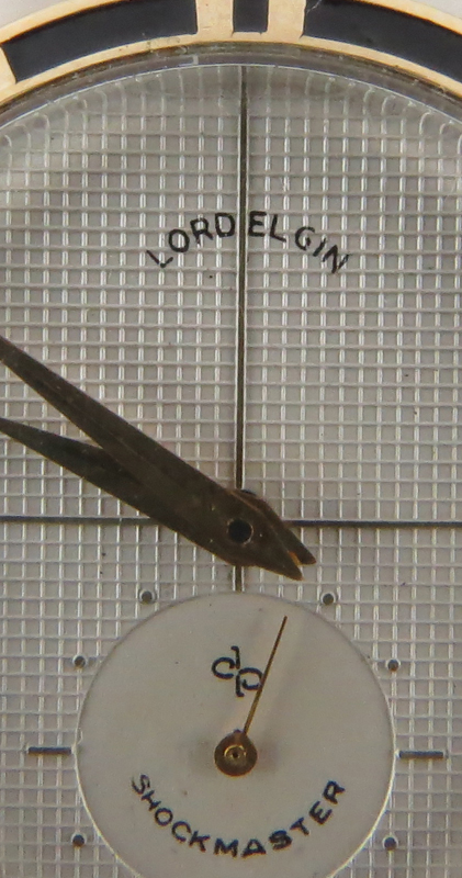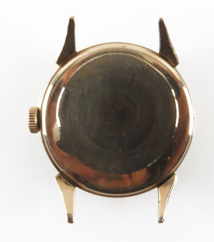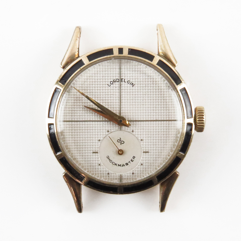 Vintage Lord Elgin "Shockmaster" 14 Karat Gold Filled Watch. Decorated with gold toned baton compass numerals and white colored dial with "squared" overlay motif, seconds hand at the 6 position. Manual wind movement. Stamped 14k yellow gold case by Wadsworth. No band, minor rubbing otherwise good condition. Measures 30mm. The gallery does not warranty the running condition of watches. Shipping $28.00 (estimate $100-$200)