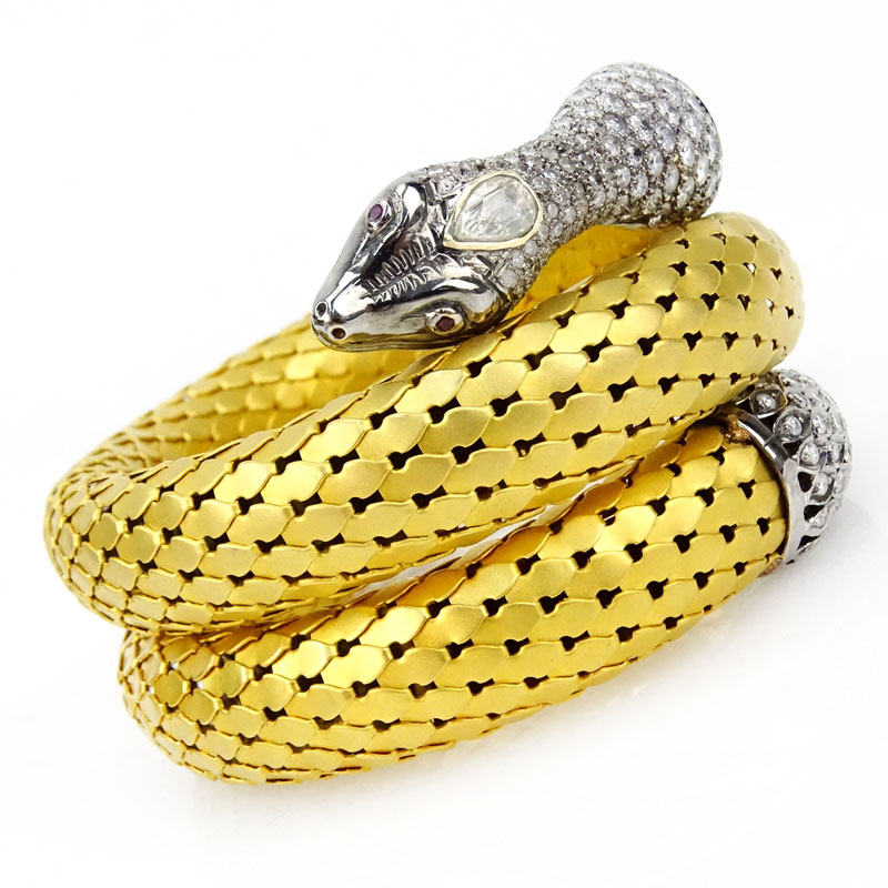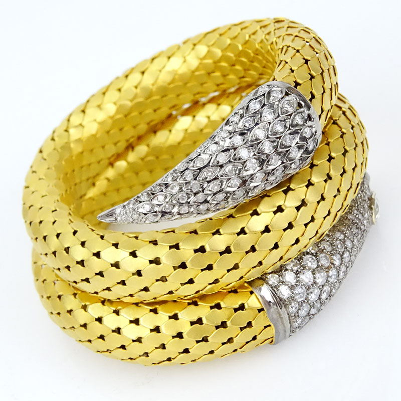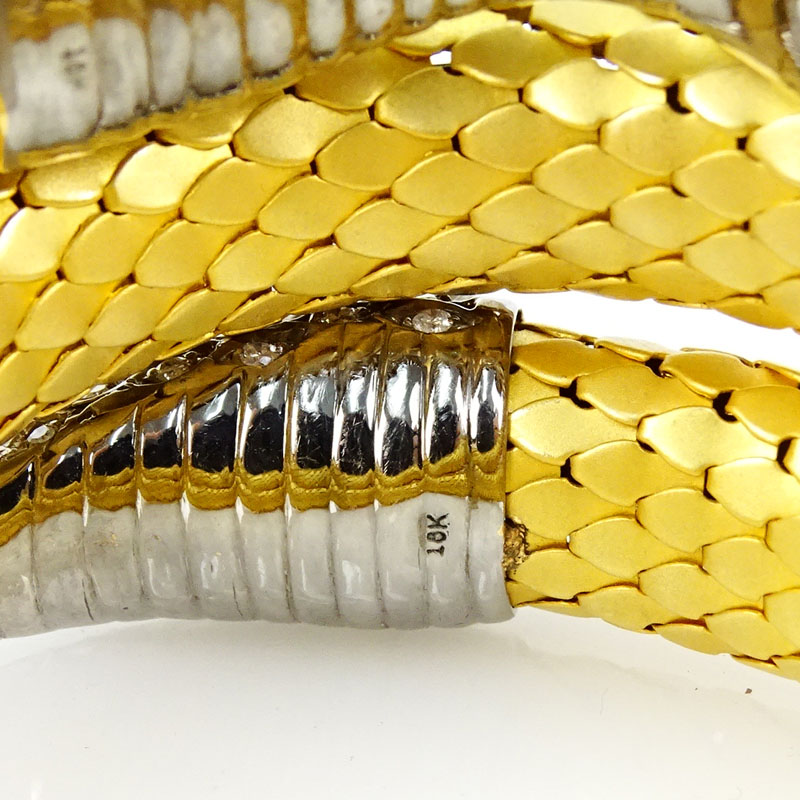 Very Fine and Rare Antique 18 Karat Yellow and White Gold Flexible Snake Bracelet accented with approx. 6.0 Carat Rose Cut Diamonds. Diamonds H-I color, SI1 clarity. Stamped 18K. Very good antique condition. Measures 1-5/8" W. Approx. weight: 54.2 pennyweights. Shipping $34.00 (estimate $8000-$12000)