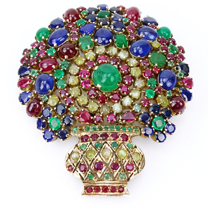 Vintage Multi Stone and 14 Karat Yellow Gold Tutti Frutti Brooch. Vivid saturation of color throughout. Missing one very small emerald otherwise good condition. Measures 2-3/8" H, 2" W. Approx. weight: 21.20 pennyweights. Shipping $30.00 (estimate $1750-$2250
