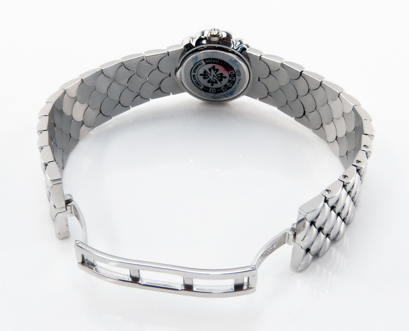 Lady's Circa 1999 Patek Philippe 18 Karat White Gold and Diamond Bracelet Watch 4872/1 with Mother of Pearl Dial and Quartz Movement. Stamped 750. Fine quality diamonds throughout. As new condition with hang tag. Case measures 25mm. Not running, needs battery. Please note the gallery does not warranty the running condition of watches. Approx. weight: 66.75 pennyweights. Shipping $34.00 (estimate $15000-$20000)