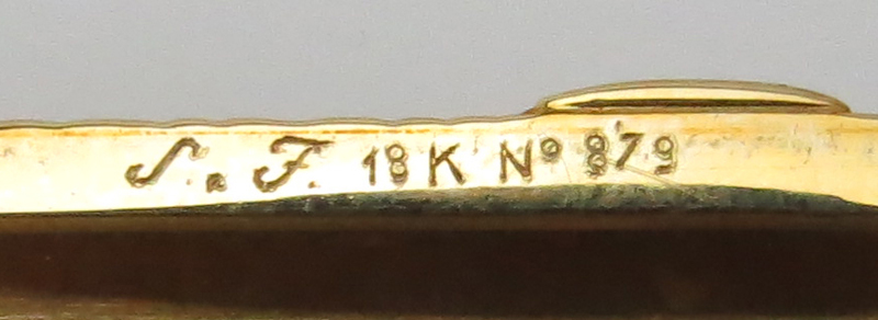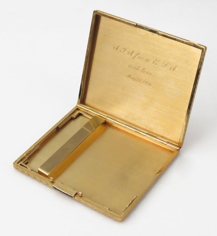Circa 1960s Spritzer & Furhmann 18 Karat Yellow Gold Cigarette Case with Sapphire Clasp. Stamped S.F. 18K No. 879. Good vintage condition. Inscribed "S.J.S. from E.F.S. with love May 24, 1966". Measures 3" x 3-1/2". Approx. weight: 87.5 pennyweights. Shipping $34.00 (estimate $3000-$4000)