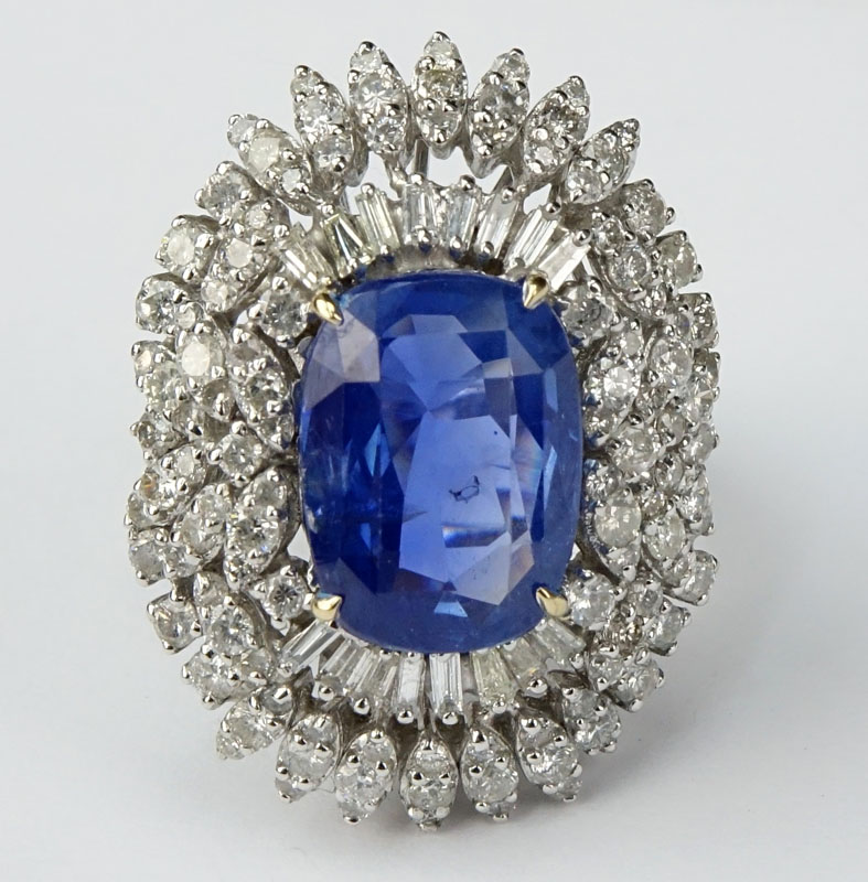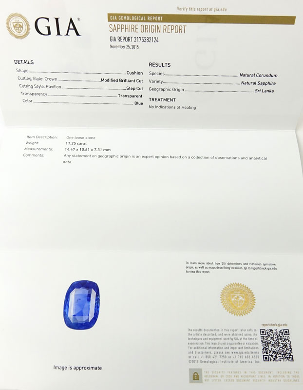 GIA Certified 11.25 Carat Oval Cushion Cut Unheated Ceylon/Sri Lanka Sapphire, 4.50 Carat Diamond and Platinum Ring. Sapphire with vivid saturation of color, measures 14.47 x 10.61 x 7.31mm. Diamonds E-F color, VS-SI clarity. Unsigned. Very good condition. Ring size 7-1/2. Approx. weight: 10.70 pennyweights. GIA Report 2175382124 dated 11/25/15 to accompany this lot. Shipping $32.00 (estimate $30000-$50000)