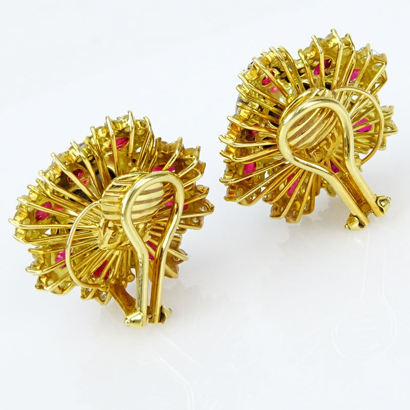 Beautiful Quality Approx. 10.0 Carat Oval Cut Burma Ruby, 5.0 Carat Round Brilliant Cut Diamond, 15mm South Sea Pearl and 18 Karat Yellow Gold Earrings. Rubies with very fine color. Diamonds F-G color, VS1-VS2 clarity. Stamped 18K. Very good condition. Measures 1-1/8" diam. Approx. weight: 24.10 pennyweights. Shipping $32.00 (estimate $8000-$12000)