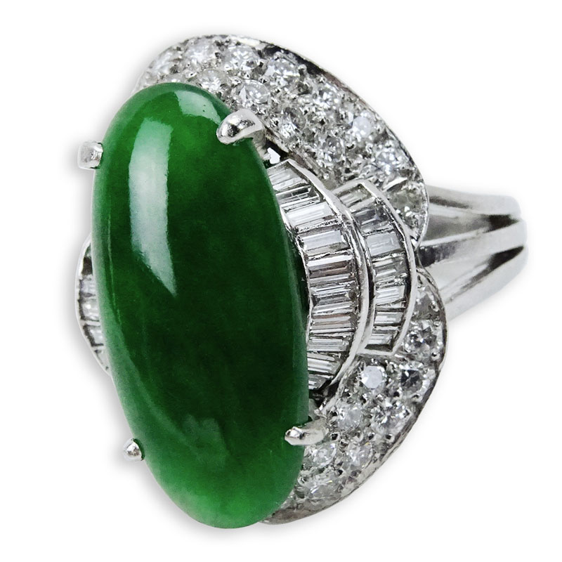 Art Deco Designed Platinum and Jade Ring. Set in the center with Cabochon Jade. Jade with good green color. Accented throughout with numerous round and baguette cut diamonds. Diamonds F-G color, VS1-VS2 clarity. Ring size 6. Very good condition. Approx. weight: 8.6 pennyweights. Shipping $28.00 (estimate $10000-$15000)