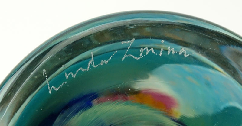 Linda Zmina, American (20th Century) Colorful Hand Blown Art Glass Vase. Closed lip vase decorated with layers of colored glass. Signed on underside. Good condition. Measures 10-1/4" H. Shipping: Third party (estimate $300-$400)