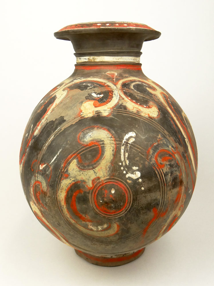 Chinese Han Dynasty (206 BC–AD 220) Pigment Painted Pottery Cocoon Vase. Unsigned. Surface Wear Consistent with Age and Use Otherwise Good Antique Condition. Measures 13 Inches Tall and 13-1/2 Inches Wide. Shipping $145.00 (estimate $800-$1200)