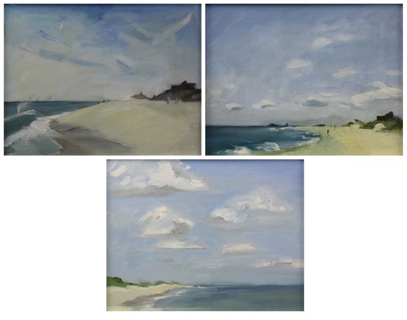Burton (20th century) Three (3) Oil on Canvas Seascapes. Artist name and title en verso. Good condition. Largest measures 17" H x 21" W. Shipping: Third party (estimate $100-$150)