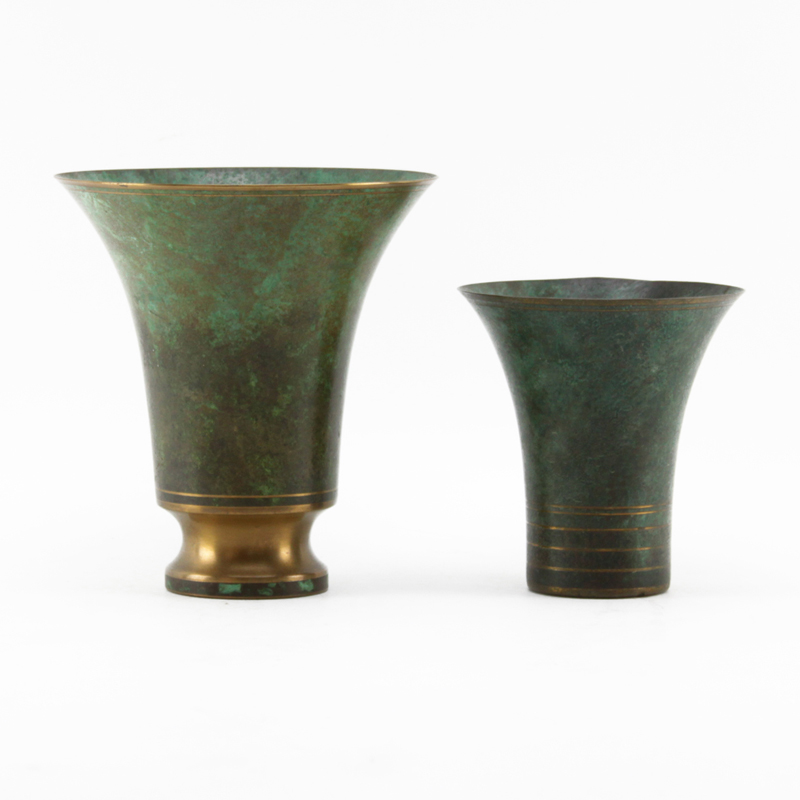 Two (2) Carl Sorensen Patinated Bronze Vases. Both signed. The smaller vase slightly out of round or good condition. Measures 7-1/2" H and 5-1/8 H. Shipping $52.00 (estimate $100-$150)