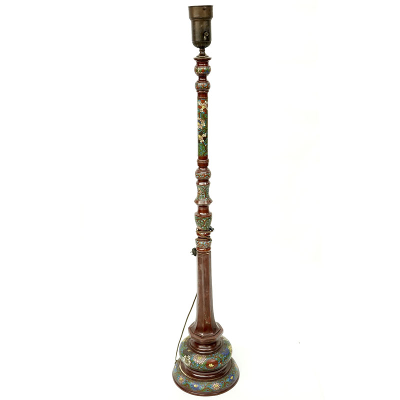 Antique Japanese Champlevé Bronze Floor Lamp. Decorated with champlevé enamel flower work, 8 sided and baluster form stem on brown patina surface. Some rubbing and surface wear, missing shade otherwise good condition. Measures 55-1/2" H. Shipping: Third party (estimate $300-$400)