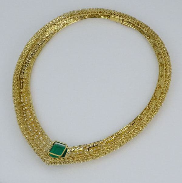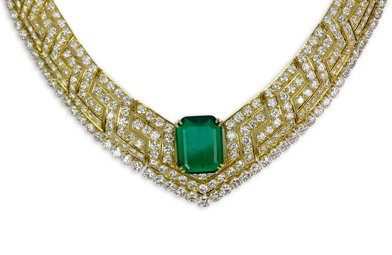 Stunning AGL Certified 9.23 Carat Emerald Cut Colombian Emerald, 50.0 Carat Round Brilliant Cut Diamond and 18 Karat Yellow Gold Necklace. Emerald with vivid saturation of color. Diamonds E-F color, VVS-VS clarity. Signed 750. Very good condition. Measures 16" L, 1-1/4" W. Approx. weight: 100.4 grams. AGL Report CS 59316 dated 2/21/2014 to accompany this lot. Shipping $38.00 (estimate $90000-$120000)
