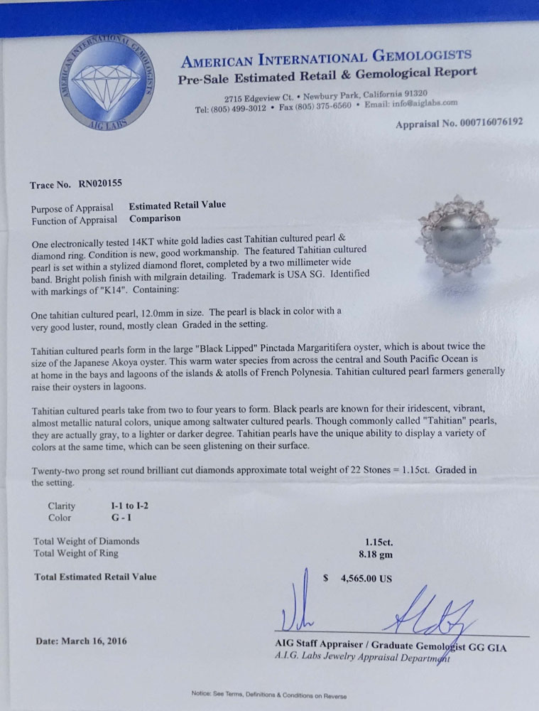 AIG Certified 12.0mm Tahitian Black Pearl, .92 Carat Round Brilliant Cut Diamond and 14 Karat White Gold Ring. Pearl with very good luster and mostly blemish free. Diamonds G-I color, I1-I2 clarity. Signed 14K. Very good condition. Ring size 7-1/2. Approx. weight: 5.20 pennyweights. AIG Report 00071606192 dated 3/16/16 to accompany this lot. Shipping $30.00 (estimate $1000-$1500)