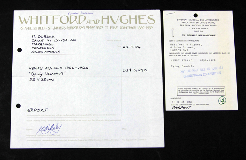 Henry Ryland, British (1856-1924) Watercolor on paper "Tying Sandals" Signed lower left. Gallery label en verso and Original Bill of sale from Whitford and Hughes, London included. Very good condition. Measures 21" x 15" (sight), frame measures 33-1/2" x 26-3/4". Shipping $235.00 (estimate $2000-$3000)
