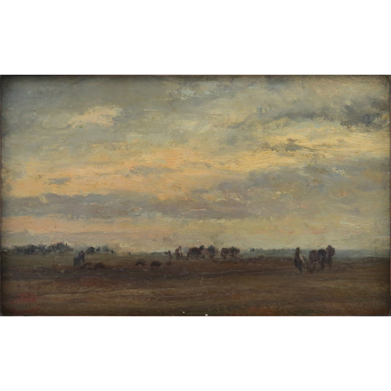 Constant Troyon (FRENCH, 1810-1865) Oil on panel Sketch "Labourage en plain, ciel nuageux" Label en verso. Stamped. Measures 5-3/4" x 9", frame measures 7-3/4" x 11". Shipping $48.00 (estimate $600-$800)