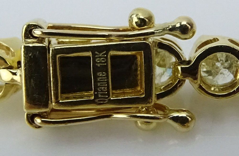 AIG Certified 8.52 Carat Round Brilliant Cut Diamond and 18 Karat Yellow Gold Tennis Bracelet. Diamonds K-M color, I1-I2 clarity. Signed 18K. Very good condition. Measures 7-3/8" L. Approx. weight: 9.70 pennyweights. AIG Report 019915188041 dated 7/7/15 to accompany this lot. Shipping $30.00 (estimate $3500-$4500)