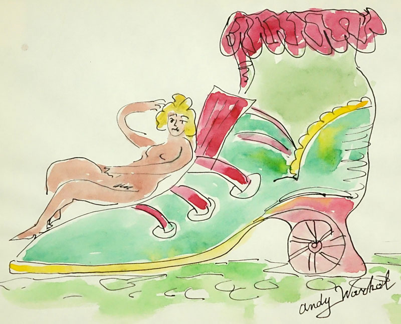 In The Manner Of: Andy Warhol, American (1928-1987) Ink and watercolor "Shoe Illustration". Bears signature Andy Warhol. Light toning or in good condition. Measures 8-7/8" x 11-3/4", frame measures 17" x 20". Shipping $85.00 (estimate $150-$250)