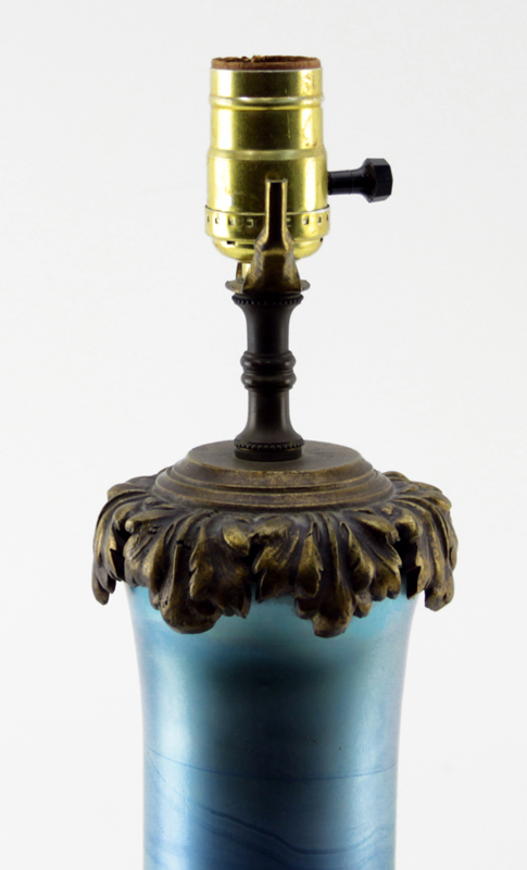 Antique Steuben Blue Iridescent Art Glass Vase Mounted as Lamp. Depicts a baluster form vase mounted on leaf/foliage style top and platform. Good condition. Measures 19-1/2" H. Shipping: Third party (estimate $100-$150)