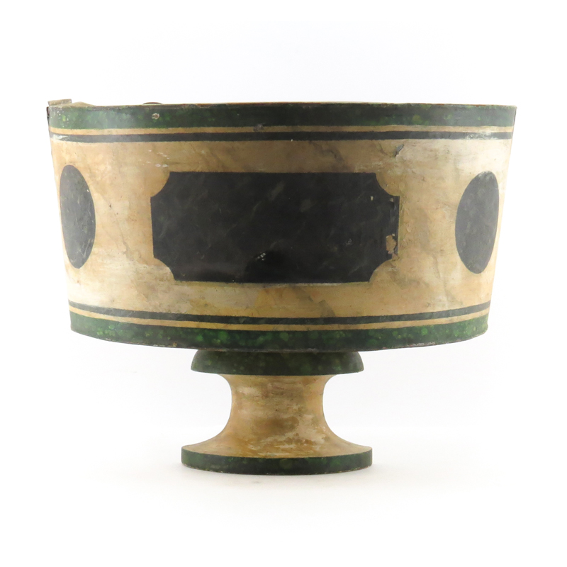 Vintage Painted Tole Hanging Jardiniere. Unsigned. Wear and rubbing. Measures 17-1/2" H x 23-1/4" W x 10-12" D. Shipping: Third party (estimate $200-$300)