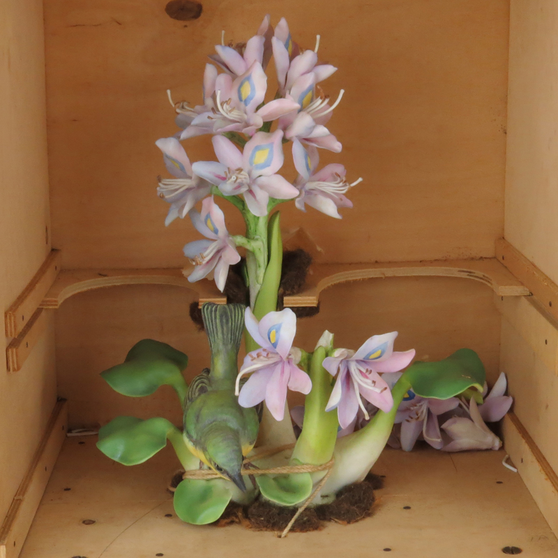 Royal Worcester Dorothy Doughty Yellow Throat with Hyacinth Porcelain Bird Figurine in custom wood case. No visible signature as it is mounted in case. Broken stems (included). Measures 12" H. Shipping: Third party (estimate $200-$400)