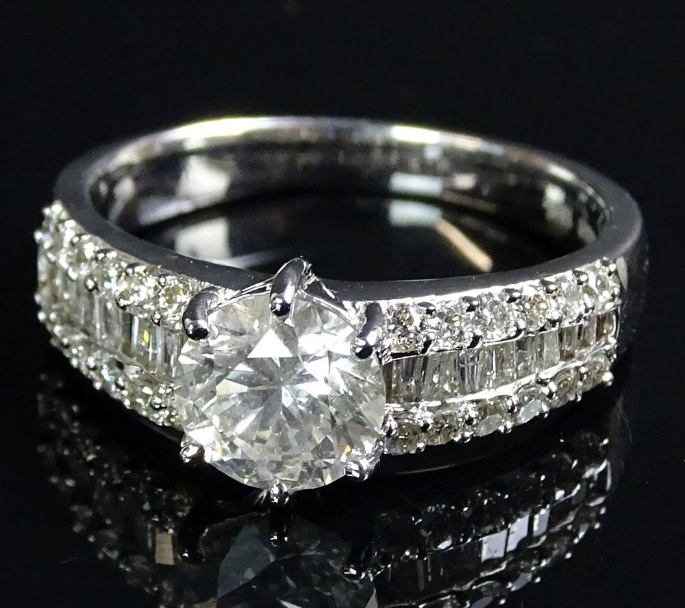 AIG Certified 1.85 Carat Diamond and 18 Karat White Gold Engagement Ring set in the center with a 1.23 Carat Round Brilliant Cut Diamond and accented with .62 Carat Round Brilliant and Baguette Cut Diamonds. Center diamond I color, I1 clarity. Accent diamonds G-I color, SI1-I1 clarity. Signed 18K. Very good condition. Ring size 7. Approx. weight: 3.15 pennyweights. AIG report 019915160023 dated 6/9/2015 to accompany this lot. Shipping $30.00 (estimate $3000-$4000)