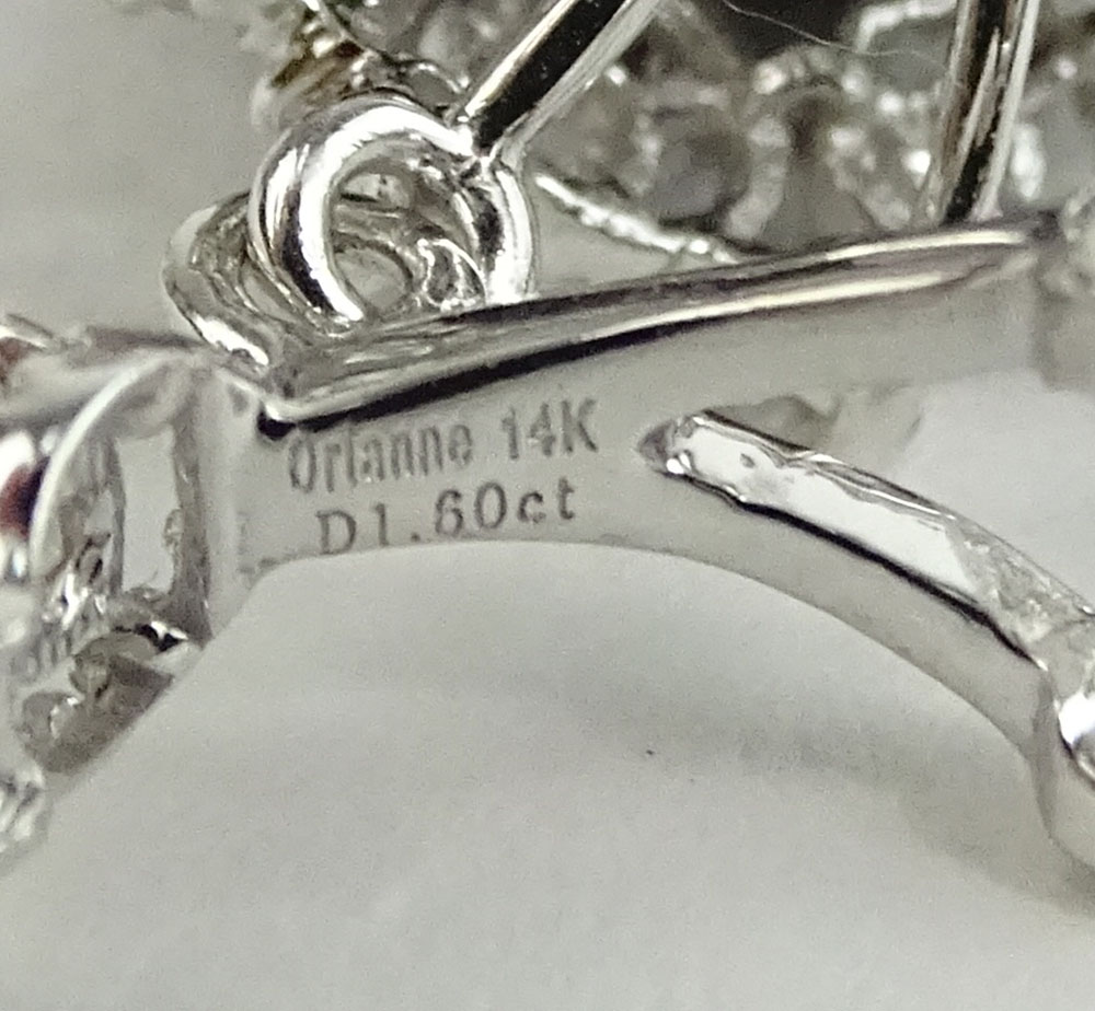 AIG Certified Tahitian Black Pearl, 1.60 Carat Round Brilliant Cut Diamond and 14 Karat White Gold Chandelier Earrings. Pearls measure 12.5mm with good luster. Diamonds G-I color, I1-I2 clarity. Signed 14K. Very good condition. Measure 1-5/8" L. Approx. weight: 8.25 pennyweights. AIG report 000716083053 dated 3/23/2106 to accompany this lot. Shipping $30.00 (estimate $1200-$1600)