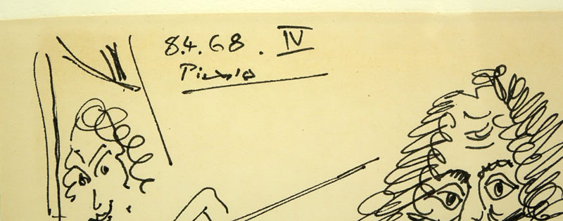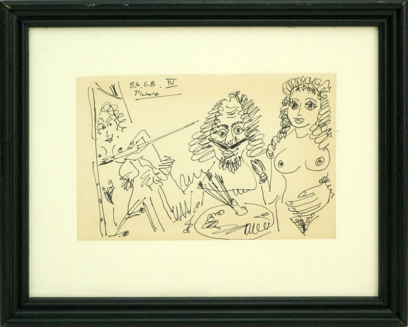 After: Pablo Picasso, Spanish (1881-1973) Engraving "Artist and Model" 8.4.68 IV Picasso. Signed in plate. Light toning or in good condition. Measures 4-3/4" x 7-1/4", frame measures 9-1/4" x 11-1/4". Shipping $42.00 (estimate $200-$400)