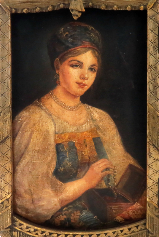After: Konstantin Egorovich Makovsky, Russian (1839-1915) Oil on Canvas Laid on Board, Portrait Triptych in Carved and Gilt Wood Frame. Center panel bears signature and dated 1893. Good condition. Center panel measures 24-1/2" H, 19-1/2" W; frame measures 29" H, 46" W. Shipping: Third party (estimate $1500-$2500)
