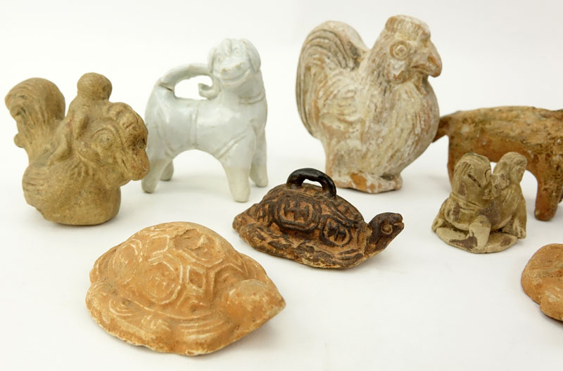 Collection of Nine (9) Early Chinese Pottery and Stone Mat Weights and Figurines. Unsigned. One with repair to tail or in good condition. Various sizes, largest 3-1/4" H. Provenance: The Shepps Collection, Palm Beach, Florida. A copy of complete provenance available upon request. Shipping $38.00 (estimate $200-$300)